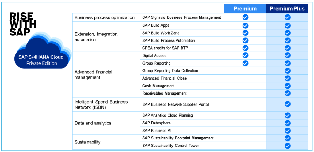 The RISE with SAP packages have been streamlined and optimized to better support customers migrating to the cloud with a tailored-to-fit cloud ERP that adapts to their unique transformation. Customers have a choice between the Premium edition and Premium Plus edition.