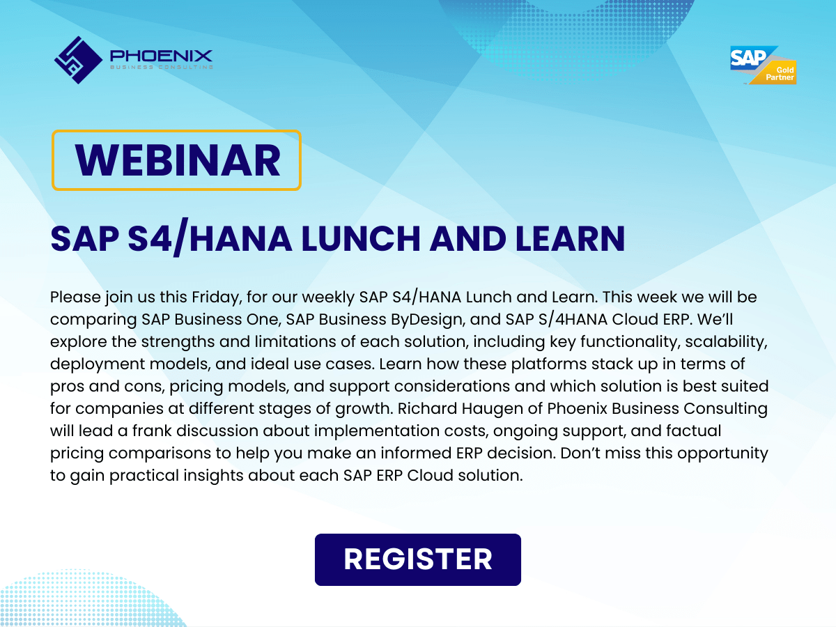 Phoenix Business Consulting provides frequent live educational webinars presented by some of the top Subject Matter Experts (SMEs) in the nation. Topics discussed in these free webinars range from best practices, industry regulation changes, software integrations, compliance updates and SAP software training.